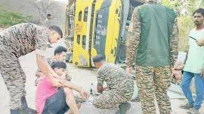 सड़क पर मौत का खेल: पुसपाल घाट में कंक्रीट हाइवा पलटा, तीन लोग घायल