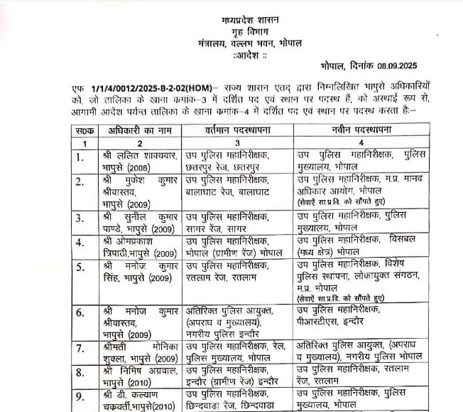 इंदौर और भोपाल की टीम में बदलाव किया गया है। मोनिका शुक्ला को भोपाल एडीसीपी की जिम्मेदारी दी गई है।वहीं राजेश कुमार सिंह को इंदौर क्राइम एडीसीपी पद पर नियुक्ति दी गई है। दोनों शहर प्रदेश के दो बड़े नगर हैं जहां क्राइम की दर भी अन्य जिलों की अपेक्षा ज्यादा है। ललित शाक्यवार को पुलिस मुख्यालय में उप पुलिस महानिरीक्षक के पद पर तैनात किया गया है। वहीं बालाघाट रेंज में तैनात मुकेश कुमार श्रीवास्तव को मध्य प्रदेश मानव अधिकार आयोग में DIG के पद पर तैनात किया गया है।