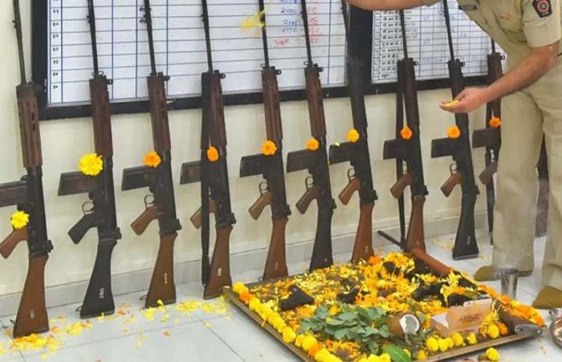शस्त्र पूजन के लिए, सुबह स्नान ध्यान आदि करके शस्त्रों की गंगाजल से सफाई कर लें और पूजा मुहूर्त में साफ वस्त्र बिछाकर सभी शस्त्रों को उसपर रख लें। उनके ऊपर दशहरा पूजा सामिग्री अक्षत, पुष्प, रोली, अक्षत, चंदन इत्यादि छिड़क कर धूप दीप से विधि विधान से पूजन करें।