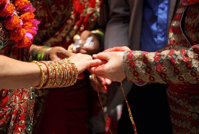दोनों को संयुक्त रूप से एक गुलाब के फूलों की माला अर्पित करें।